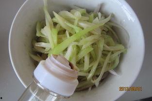 3. 将红葱头丝、佛手瓜丝、黄瓜丝放入碗中,加入生抽、醋、盐调味。